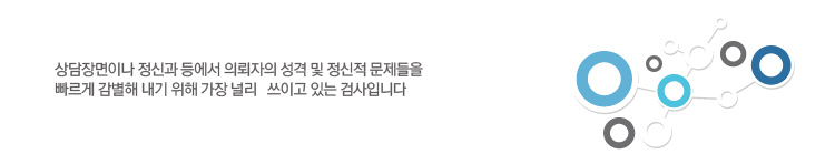 - »ó´ãÀå¸éÀ̳ª Á¤½Å°ú µî¿¡¼ ÀÇ·ÚÀÚÀÇ ¼º°Ý ¹× Á¤½ÅÀû ¹®Á¦µéÀ» ºü¸£°Ô °¨º°ÇØ ³»±â À§ÇØ °¡Àå ³Î¸® ¾²À̰í ÀÖ´Â °Ë»çÀÔ´Ï´Ù. ÀÌ °Ë»ç¸¦ ÅëÇØ ÀÚ½ÅÀÇ ¼º°Ý Ư¼º°ú ÇÔ²², Ȥ½Ã ³»ÀçÇØ ÀÖÀ»Áö ¸ð¸£´Â